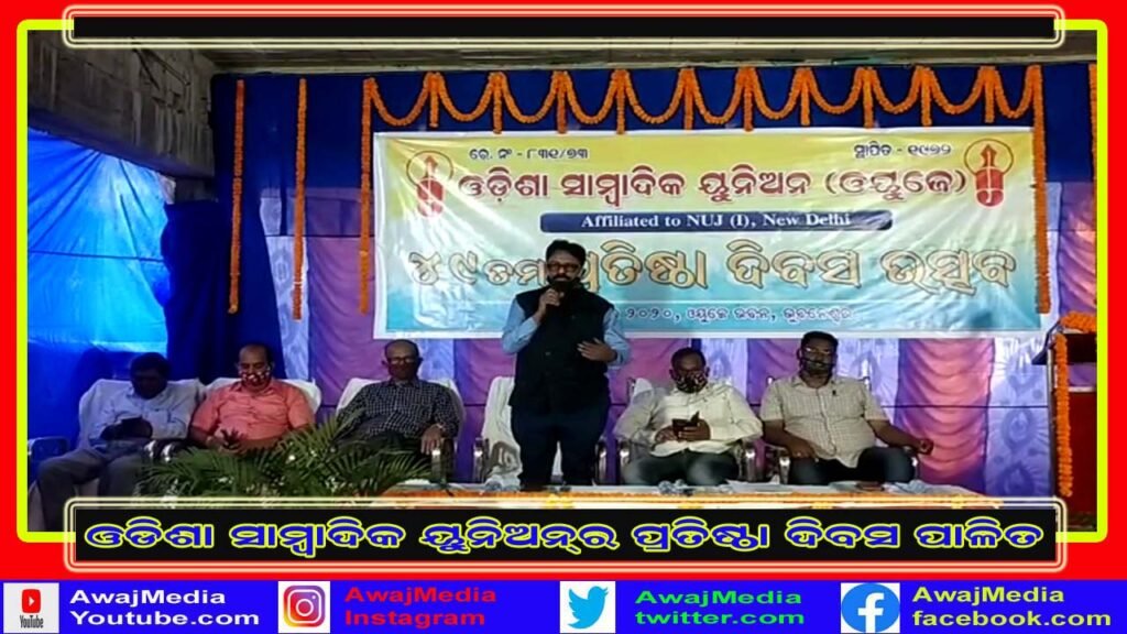 ଭୁବନେଶ୍ୱର ( ଆୱାଜ ମିଡ଼ିଆ ) – ବ୍ୟୁରୋ ରିପୋର୍ଟ : ଓଡିଶା ସାମ୍ବାଦିକ ୟୁନିଅନର 49 ତମ ପ୍ରତିଷ୍ଠା ଦିବସ ଓୟୁଜେ ଭବନ ପରିସରରେ ପାଳିତ ହୋଇଯାଇଛି . ରାଜ୍ୟ ଗୃହ ଏବଂ ଶକ୍ତି ବିଭାଗର ମନ୍ତ୍ରୀ କ୍ୟାପଟେନ ଦିବ୍ୟଶଙ୍କର ମିଶ୍ର କାର୍ଯ୍ୟକ୍ରମରେ ମୁଖ୍ୟ ଅତିଥି ଭାବରେ ଯୋଗଦେଇ – ସାମ୍ବାଦିକ ମାନେ ହିଁ ପ୍ରକୃତ କରୋନା ଯୋଦ୍ଧା ବୋଲି ପ୍ରକାଶ କରିଛନ୍ତି . ଓୟୁଜେ ର ରାଜ୍ୟ ସଭାପତି ପ୍ରସନ୍ନ କୁମାର ମହାନ୍ତିଙ୍କ ଅଧ୍ୟକ୍ଷତାରେ ଆୟୋଜିତ ଏହି ଉତ୍ସବରେ ରାଜ୍ୟ ସାଧାରଣ ସମ୍ପାଦକ ଅଶୋକ କୁମାର ନନ୍ଦ , ରାଜ୍ୟ ଉପ ସଭାପତି କିଷାନ ରାଉତ , ତପନ ସାହୁ , କୋଷାଧ୍ୟକ୍ଷ ଅମୁଲ୍ୟ ରଞ୍ଜନ ସ୍ୱାଇଁ , ଜାତୀୟ କାର୍ଯ୍ୟକାରିଣୀ ସଦସ୍ୟ ଲୋକନାଥ ସିଂହ , ସମ୍ପାଦକ ଇଙ୍ଗିତ ପଣ୍ଡା ଯୋଗଦେଇ ରାଜ୍ୟରେ କାର୍ଯ୍ୟରତ ସାମ୍ବାଦିକ ମାନଙ୍କର ବିଭିନ୍ନ ସମସ୍ୟା ଉପରେ ଆଲୋକପାତ କରିଥିଲେ . ବରିଷ୍ଠ ସାମ୍ବାଦିକ ରବି ଦାସ ସ୍ୱତନ୍ତ୍ର ଅତିଥି ଭାବରେ ଯୋଗଦେଇ ରାଜ୍ୟରେ ସାମ୍ବାଦିକ ସୁରକ୍ଷା ପ୍ରସଙ୍ଗରେ ସରକାର ତୁରନ୍ତ ପଦକ୍ଷେପ ଗ୍ରହଣ କରିବା ଆବଶ୍ୟକ ବୋଲି ମତ ରଖିଥିଲେ . ଓୟୁଜେ ର ସ୍ୱର୍ଣ୍ଣ ଜୟନ୍ତୀ ଲୋଗୋକୁ ମୁଖ୍ୟ ଅତିଥି ମନ୍ତ୍ରୀ ଦିବ୍ୟଶଙ୍କର ମିଶ୍ର ଉନ୍ମୋଚନ କରିବା ସହିତ ରାଜ୍ୟର ୩୧ ଟି ସାଙ୍ଗଠନିକ ଜିଲ୍ଲାର ସଭାପତି ଏବଂ ସମ୍ପାଦକ ମାନଙ୍କୁ ସମ୍ମାନୀତ କରାଯାଇଥିଲା .