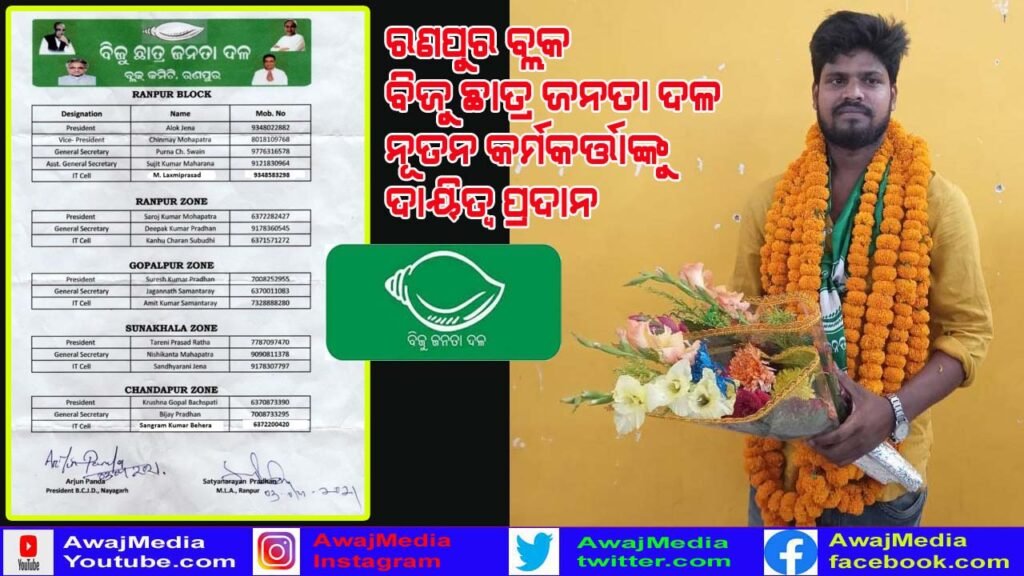ନୟାଗଡ ( ଆୱାଜ ମିଡ଼ିଆ ) – କିଶୋର ମହାପାତ୍ର : ନୟାଗଡ ଜିଲ୍ଲା ରଣପୁର ବ୍ଲକ ବିଜୁ ଛାତ୍ର ଜନତା ଦଳର ବିଭିନ୍ନ ସାଙ୍ଗଠନିକ ପଦବୀ ପାଇଁ ନୂତନ କର୍ମକର୍ତ୍ତାଙ୍କୁ ଦାୟିତ୍ୱ ପ୍ରଦାନ କରାଯାଇଛି . ଚାନ୍ଦପୁର ଜୋନର ବିଜୁ ଛାତ୍ର ଜନତା ଦଳର ସଭାପତି ଭାବେ କୃଷ୍ଣ ଗୋପାଳ ବାଚସ୍ପତି, ସାଧାରଣ ସମ୍ପାଦକ ଭାବେ ବିଜୟ ପ୍ରଧାନ ଏବଂ ଆଇ.ଟି. ସେଲର କାର୍ଯ୍ୟକର୍ତ୍ତା ଭାବେ ସଂଗ୍ରାମ କୁମାର ବେହେରାଙ୍କୁ ମନୋନୀତ କରାଯାଇଥିବା ଜଣା ପଡିଛି l କୃଷ୍ଣଙ୍କ ଉପରେ ଆସ୍ଥା ପ୍ରକଟ କରି ତାଙ୍କୁ ଚାନ୍ଦପୁର ଜୋନର ସଭାପତି ଭାବେ ଦାୟିତ୍ୱ ଦେଇ ଥିବାରୁ ସେ ରଣପୁର ବିଧାୟକ ସତ୍ୟ ନାରାୟଣ ପ୍ରଧାନଙ୍କୁ ଧନ୍ୟବାଦ ଜଣାଇଛନ୍ତି l ନବ ନିର୍ବାଚିତ କର୍ମକର୍ତ୍ତା ମାନେ ସ୍ଥାନୀୟ ଅଞ୍ଚଳରେ ଉନ୍ନତି ମୂଳକ କାର୍ଯ୍ୟ ସହ ଦଳକୁ ତୃଣମୂଳ ସ୍ତରରେ ମଜବୁତ କରିବା ପାଇଁ ଉଦ୍ୟମ ଜାରି ରଖିବେ ବୋଲି ମତ ଦେଇଛନ୍ତି l