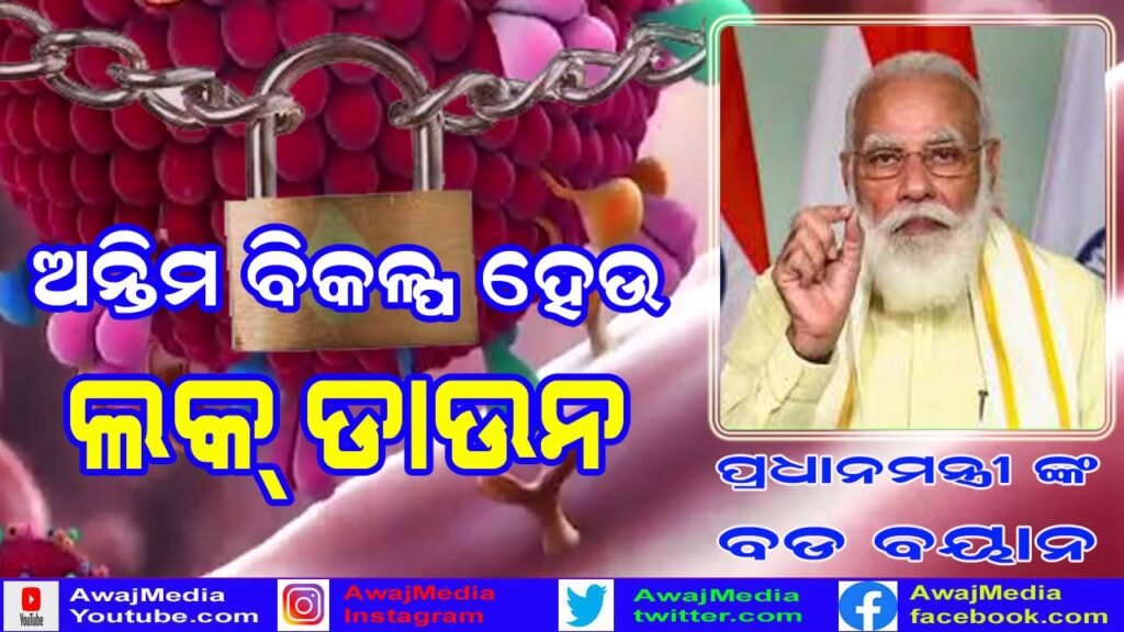 ଭୁବନେଶ୍ୱର ( ଆୱାଜ ମିଡ଼ିଆ ) – ବ୍ୟୁରୋ ରିପୋର୍ଟ : ଦେଶକୁ ଲକ ଡାଉନ ରୁ ବଞ୍ଚାଇବାକୁ ହେବ . ରାଜ୍ୟ ମାନେ ଲକ ଡାଉନ ଏଡ଼ାଇବାକୁ କଡା କଟକଣା ଜାରି କରନ୍ତୁ . ଲକ ଡାଉନ ହେଉ ଅନ୍ତିମ ବିକଳ୍ପ . ଦେଶବାସୀ କୋଭିଡ ନିୟମ ମାନନ୍ତୁ . କରୋନା ମହାମାରୀ ସଂକ୍ରମଣର ଦ୍ଵିତୀୟ ଲହରୀରେ ସମଗ୍ର ଦେଶ ଆତଙ୍କିତ . ଦେଶବାସୀଙ୍କୁ ସମ୍ବୋଧିତ କରି ଏପରି କହିଛନ୍ତି ପ୍ରଧାନମନ୍ତ୍ରୀ ନରେନ୍ଦ୍ର ମୋଦୀ .