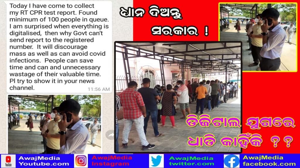 ଭୁବନେଶ୍ୱର ( ଆୱାଜ ମିଡ଼ିଆ ) – ବ୍ୟୁରୋ ରିପୋର୍ଟ : କରୋନା ସଂକ୍ରମଣର ଦ୍ଵିତୀୟ ଲହରୀ ତାର କାୟା ବିସ୍ତାର କରୁଥିବା ସମୟରେ , କଡା କଟକଣା ଏବଂ ସାମାଜିକ ଦୂରତା ଉପରେ ଗୁରୁତ୍ୱ ଦେଉଛନ୍ତି ସରକାର . ତେବେ ଡାକ୍ତରଖାନା କୁ ଯାଇ କୋଭିଡ ପରୀକ୍ଷା କରାଉଥିବା ଲୋକମାନେ ରିପୋର୍ଟ ଆଣିବାକୁ ଯାଇ ଅଯଥା ଗହଳିରେ ଫସିବା ସହ ବହୁ ହଇରାଣ ହରକତ ହେଉଛନ୍ତି . ପରୀକ୍ଷା ସମୟରେ ନାମ ଠିକଣା ଏବଂ ଯୋଗାଯୋଗ ନମ୍ବର ଦିଆଯାଉ ଥିଲେବି ତାହା କାମରେ ଆସୁନି . ଡିଜିଟକ ଯୁଗର ନାରା ଦେଉଥିବା ସରକାର ଲୋକଙ୍କୁ ରିପୋର୍ଟ ମେସେଜ ମାଧ୍ୟମରେ ନପଠାଇ କାହିଁକି ଧାଡିରେ ଠିଆ କରାଉଛନ୍ତି ବୋଲି କେତେକ ବ୍ୟକ୍ତି ପ୍ରଶ୍ନ କରିଛନ୍ତି .