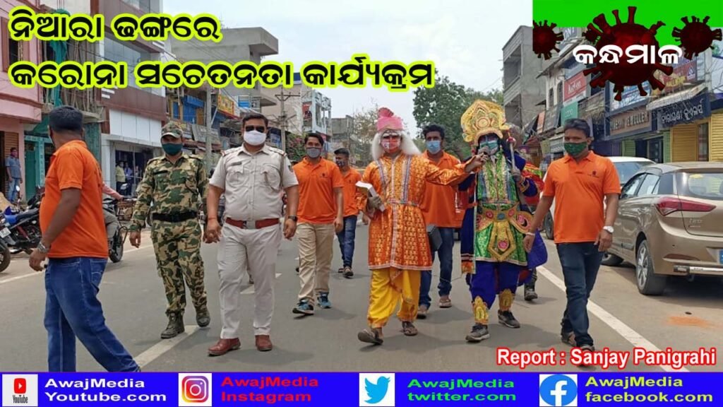 କନ୍ଧମାଳ ( ଆୱାଜ଼ ମିଡ଼ିଆ ) – ସଞ୍ଜୟ କୁମାର ପାଣିଗ୍ରାହୀ : କନ୍ଧମାଳ ଜିଲାରେ ନିଆରା ଢଙ୍ଗରେ କରୋନା ସଚେତନତା ସୃଷ୍ଟି କରାଯାଉଛି । ଜିଲା ପୁଲିସ ପ୍ରଶାସନ ଓ ସ୍ୱେଚ୍ଛାସେବୀ ସଂଗଠନ ଟିମ୍ ହ୍ୟୁମାନିଟି ର ସଦସ୍ୟ ମାନଙ୍କ ପକ୍ଷରୁ କରୋନା ସଚେତନତା ଅଭିଯାନକୁ ଜୋର୍ଦାର କରାଯାଉଛି । ଯମରାଜ ଓ ଚିତ୍ରଗୁପ୍ତ ଭୂମିକାରେ ଅବତୀର୍ଣ୍ଣ ହୋଇ କରୋନା ଭୂତାଣୁକୁ କିଭଳି ପ୍ରତିହତ କରାଯାଇ ପାରିବ ତାହା ଉପରେ ଲୋକଙ୍କୁ ସଚେତନ କରୁଛନ୍ତି। ସମଗ୍ର ଦେଶରେ ପୁଣି କରୋନା କଡ ଲେଉଟାଇଥିବା ବେଳେ ସେଥିରୁ କନ୍ଧମାଳ ଜିଲାକୁ ମଧ୍ୟ ଧିରେ ଧିରେ କବଳିତ କରିବାକୁ ଲାଗିଲାଣି ।