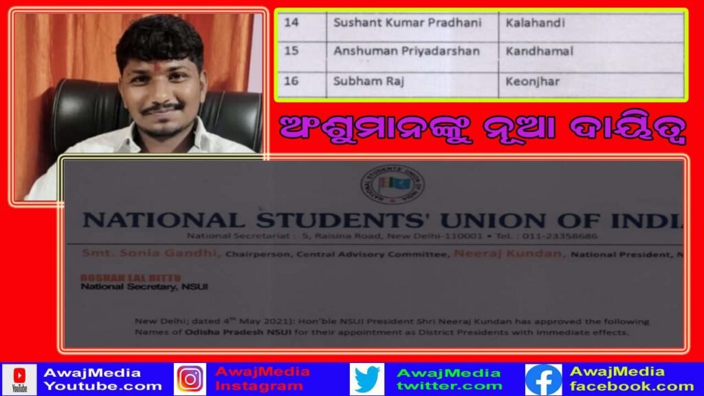 ଏନଏସୟୁଆଇ ର କନ୍ଧମାଳ ଜିଲ୍ଲା ସଭାପତି ଭାବେ ଅଂଶୁମାନ ମନୋନୀତ !!
