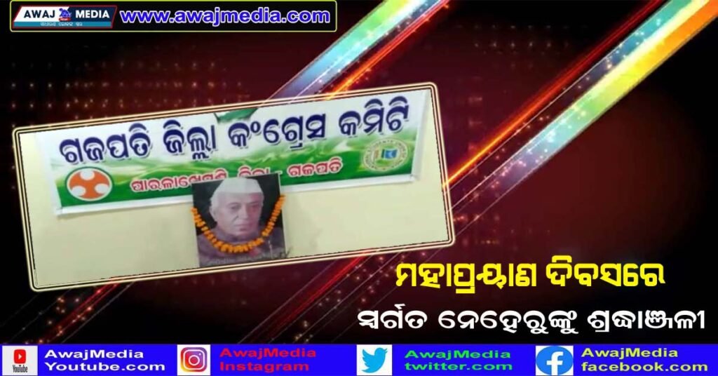 ଗଜପତି ( ଆୱାଜ ମିଡ଼ିଆ ) – ବିବେକାନନ୍ଦ ବେହେରା : ପାରଳାଖେମୁଣ୍ଡି ସ୍ଥିତ ଜିଲ୍ଲା କଂଗ୍ରେସ କାର୍ଯ୍ୟାଳୟରେ ପୂର୍ବତନ ପ୍ରଧାନମନ୍ତ୍ରୀ ସ୍ୱର୍ଗତ ଜବାହାରଲାଲ ନେହେରୁଙ୍କ ମହାପ୍ରୟାଣ ଦିବସ ପାଳିତ ହୋଇଯାଇଛି । ବର୍ତ୍ତମାନ କରୋନା ମହାମାରୀ ଉଗ୍ର ରୂପ ନେଇଥିବା ବେଳେ ସରକାରଙ୍କ ଗାଇଡ଼ ଲାଇନ କୁ ମାନି କାର୍ଯ୍ୟକ୍ରମର ଆୟୋଜନ କରାଯାଇଥିଲା . ଜିଲ୍ଲା କଂଗ୍ରେସ କାର୍ଯ୍ୟାଳୟରେ ଦଳୀୟ ସଦସ୍ୟ ମାନେ ସ୍ୱର୍ଗତ ଜବାହାରଲାଲ ନେହେରୁଙ୍କ ଫଟୋ ଚିତ୍ରରେ ପୁଷ୍ପ ମାଲ୍ୟାର୍ପଣ କରିଥିଲେ ଏବଂ ନିରାଡ଼ମ୍ବର ଭାବେ ଆୟୋଜିତ ଏହି କାର୍ଯ୍ୟକ୍ରମକୁ ବସନ୍ତ ପଣ୍ଡା ଏହି କାର୍ଯ୍ୟକ୍ରମକୁ ସଂପାଦନ କରିଥିଲେ ।