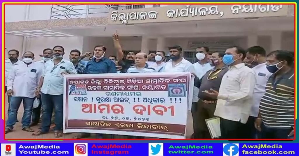ନୟାଗଡ ( ଆୱାଜ ମିଡ଼ିଆ ) – କିଶୋର ମହାପାତ୍ର : କେନ୍ଦ୍ରାପଡ଼ା ରେ ସାମ୍ବାଦିକ ଙ୍କୁ ଆକ୍ରମଣ ଘଟଣାକୁ ନେଇ ନୟାଗଡ଼ ଡିଜିଟାଲ ମିଡିଆ ଜର୍ଣ୍ଣାଲିଷ୍ଟ ଆସୋସିଏସନ୍ ର ପ୍ରତିବାଦ । ସାମ୍ବାଦିକ ଙ୍କୁ ଆକ୍ରମଣ ଘଟଣାରେ ଡିଜିଟାଲ ମିଡିଆ ଆସୋସିଏସନ୍ ଡାକରାରେ ନୟାଗଡ଼ ଜିଲ୍ଲାର ସମସ୍ତ ଜିଲ୍ଲା ସ୍ତରୀୟ ଏବଂ ବ୍ଲକ ସ୍ତରୀୟ ସଦସ୍ୟ ଏକତ୍ରିତ ହୋଇ ବିକ୍ଷୋଭ ପ୍ରଦର୍ଶନ କରିଥିଲେ . ଜିଲ୍ଲାରେ କାର୍ଯ୍ୟରତ ଡିଜିଟାଲ, ଛାପା ଗଣମାଧ୍ୟମ ଏବଂ ବୈଦୁତିକ ଗଣମାଧ୍ୟମ ର ପ୍ରତିନିଧି ମାନେ ଏକତ୍ରିତ ହୋଇ ଜିଲ୍ଲାପାଳଙ୍କ ମାଧ୍ୟମରେ ମାନ୍ୟବର ମୁଖ୍ୟମନ୍ତ୍ରୀ ଉଦ୍ଦେଶ୍ୟରେ ଦାବିପତ୍ର ପ୍ରଦାନ କରିଛନ୍ତି । ଏଥିସହିତ ଅତିଶିଘ୍ର ସାମ୍ବାଦିକ ସୁରକ୍ଷା ଆଇନ ପ୍ରଣୟନ କରିବା ପାଇଁ ଦୃଢ ଦାବି ଜଣାଇଛନ୍ତି ।
