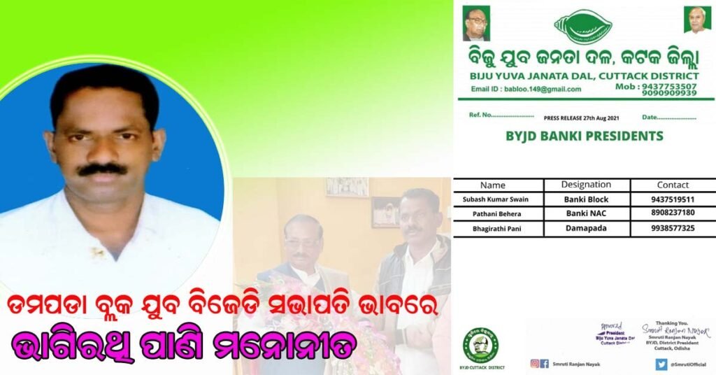ବାଙ୍କୀ ( ଆୱାଜ ମିଡ଼ିଆ ) – ଅନନ୍ତ ରଣା : ବାଙ୍କୀ ନିର୍ବାଚନ ମଣ୍ଡଳୀ ଡମପଡା ବ୍ଲକ ବିଜୁ ଯୁବ ଜନତା ଦଳ ର ନୂତନ ସଭାପତି ଭାବରେ ଭାଗିରଥି ପାଣି ଙ୍କୁ ମିଳିଲା ଦାୟିତ୍ୱ . ଡମପଡା ବ୍ଲକ ର ବିଭିନ୍ନ ମନରେଗା ପ୍ରକଳ୍ପ ନିର୍ମାଣ କାମରେ ଦୁର୍ନୀତିର ଅଭିଯୋଗ ଆସିବା ପରେ ନିଜ ପଦବୀରୁ ବିଦା ହୋଇଛନ୍ତି ବିବାଦୀୟ ନେତା ତଥା କୁସୁପଙ୍ଗି ପଞ୍ଚାୟତର ସରପଞ୍ଚଙ୍କ ସ୍ୱାମୀ ଅସୀତ ଜେନା . ବିଗତ ଦିନରେ ଦୁର୍ନୀତି ଅଭିଯୋଗ ଆସିବା ପରେ ଦଳୀୟ ଶୀର୍ଷ ନେତାଙ୍କ ଚାପରେ ନିଜ ପଦବୀରୁ ଇସ୍ତଫା ଦେଇଥିଲେ ଅସୀତ ଜେନା , ଅବଶ୍ୟ ସେ ନିଜ ଆଡୁ ଇସ୍ତଫା ନ ଦେଇଥିଲେ ପଦବୀରୁ ତଡା ଖାଇବାଟା ଥୟ ଥିଲା . କଟକ ଜିଲ୍ଲା ଯୁବ ବିଜେଡି ସଂଗଠନ ତରଫରୁ ତାଙ୍କ ଇସ୍ତଫା ଗ୍ରହଣ ସହିତ ବାଙ୍କୀ ନିର୍ବାଚନ ମଣ୍ଡଳୀର ଦୁଇଟି ବ୍ଲକ ଏବଂ ଏନଏସି ସଭାପତିଙ୍କ ନାମ ଘୋଷଣା କରାଯାଇଛି . ଡମପଡା ବ୍ଲକ ସଭାପତି ଭାବରେ ଭାଗିରଥି ପାଣି , ବାଙ୍କୀ ଏନଏସି ସଭାପତି ଭାବରେ ପଠାଣି ବେହେରା , ବାଙ୍କୀ ବ୍ଲକ ସଭାପତି ଭାବରେ ସୁବାଷ କୁମାର ସ୍ୱାଇଁ ଙ୍କ ନାମ ବିଧିବଦ୍ଧ ଭାବରେ ଘୋଷଣା କରାଯାଇଛି .