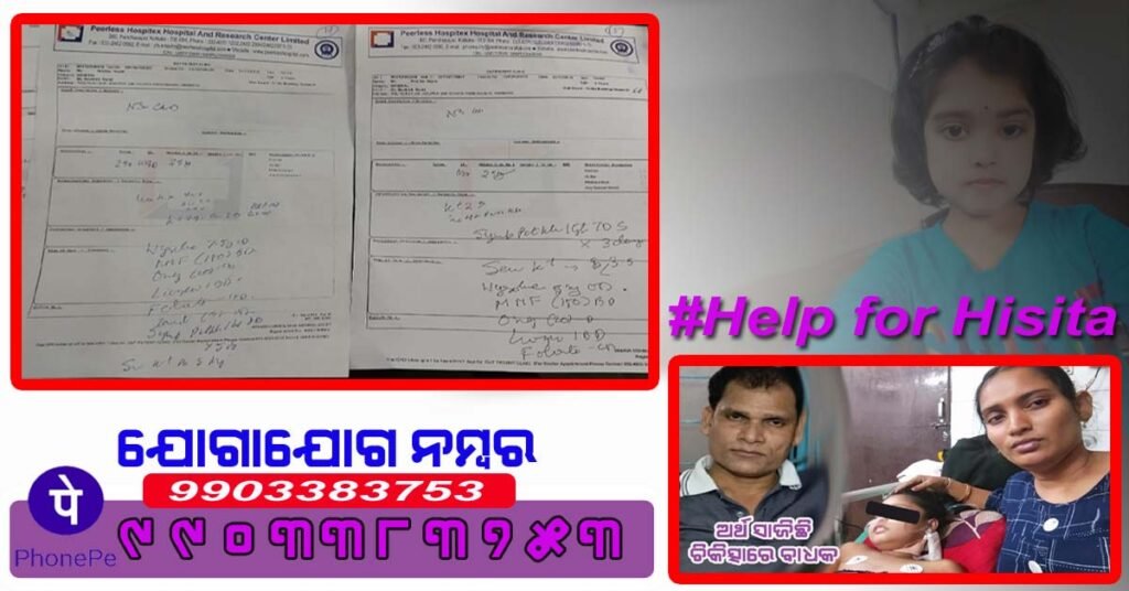 ହିଷିତା ନାୟକ , ବୟସ ମାତ୍ର ଏଗାର । ବାପା ମଦନ ନାୟକ କୋଲକାତାରେ କାମ କରନ୍ତି । ପରିବାର ବୋଲେ ଗୋଟେ ଛୋଟ ଭାଇ, ମା’ ଏବଂ ବାପା । ବିଂଝଳା ଗ୍ରାମରେ ରହୁଥୁବା ବେଳେ ୨୦୧୫ ରେ ହଠାତ ହିଷିତାଙ୍କ ଦେହ ଫୁଲିବାକୁ ଲାଗିଲା । ଚିକିତ୍ସା କରାଇବାରୁ ଜଣା ପଡ଼ିଲା ଯେ, ଝିଅର ଗୋଟେ କିଡ଼ନୀ ନଷ୍ଟ ହୋଇ ଯାଇଛି । ପଞ୍ଚମ ଶ୍ରେଣୀରୁ ପାଠ ଛାଡିବାକୁ ପଡ଼ିଲା ହିଷିତାଙ୍କୁ । ଘରେ ରହି ସେବେଠାରୁ ଔଷଧ ଖାଇ ଚିକିତ୍ସିତ ହୋଇ ଆସୁଛନ୍ତି । ତେବେ ଏକ ମାସ ତଳେ ହିଷିତାଙ୍କ ଦେହ ପୁଣି ଗୁରୁତର ହେବାରୁ କୋଲକାତାରେ ଟେଷ୍ଟ କରିବାରୁ ଜଣାପଡ଼ିଲା ତାଙ୍କର ଦ୍ଵିତୀୟ କିଡ଼ନୀ ମଧ୍ୟ ନଷ୍ଟ ହୋଇଯାଇଛି । ଏହା ଜାଣି ବାପା ମା’ ଙ୍କ ମୁଣ୍ଡରେ ଚଡକ ପଡିଯାଇଛି । କିପରି ପିଲାଟିକୁ ବଞ୍ଚାଇବେ କିଛି ବୁଦ୍ଧି ବାଟ ଦିଶୁନାହିଁ । ଡାକ୍ତର କହୁଛନ୍ତି ଯଥାଶୀଘ୍ର ୧୫ ଦିନ ମଧ୍ୟରେ ୧୫ ଲକ୍ଷ ଟଙ୍କା ଯୋଗାଡ଼ କରିବାକୁ । ଯାହାଦ୍ୱାରା ଗୋଟାଏ କିଡ଼ନୀ ଟ୍ରାନ୍ସପ୍ଲାଣ୍ଟ ହୋଇପାରିବ ଏବଂ ଝିଅଟି ବଞ୍ଚିପାରିବ ।