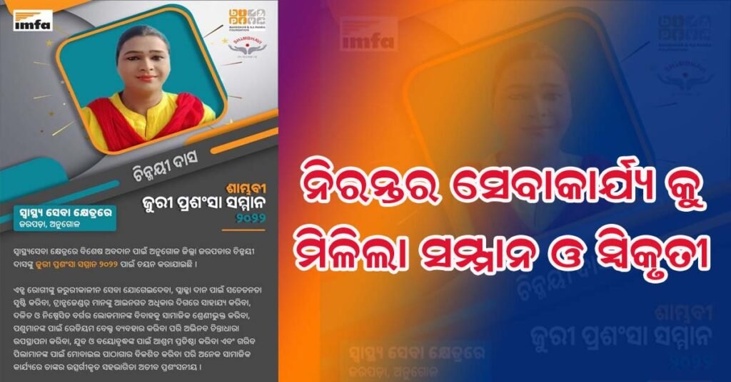 ଅନୁଗୁଳ ( ଆୱାଜ ମିଡ଼ିଆ ) – ଟଙ୍କଧର ଗଡ଼ନାୟକ : ସ୍ୱାସ୍ଥ୍ୟସେବା କ୍ଷେତ୍ରରେ ନିରନ୍ତର କାର୍ଯ୍ୟ ପାଇଁ ଅନୁଗୁଳ ଜିଲ୍ଲା ଜରପଡା ର ସାମାଜିକ କର୍ମୀ ଚିନ୍ମୟୀ ଦାସଙ୍କୁ ଶାମ୍ଭବୀ ଜୁରୀ ପ୍ରଶଂସା ସମ୍ମାନ ପ୍ରଦାନ ପାଇଁ ମନୋନୀତ କରାଯାଇଛି . କରୋନା ସମୟରେ ନିଶୁଳ୍କ ଶବଦାହ , ଅସହାୟ ବୃଦ୍ଧ ବୃଦ୍ଧା ମାନଙ୍କ ପାଇଁ ସେବାଶ୍ରମ , ପିଲା ମାନଙ୍କ ପାଇଁ ପାଠାଗାର , ତୃତୀୟ ଲିଙ୍ଗୀ ମାନଙ୍କୁ ଆଇନଗତ ଅଧିକାର ପ୍ରଦାନ ପାଇଁ କାର୍ଯ୍ୟକ୍ରମ , ପରିବେଶ ସଚେତନତା , ପ୍ଲାଜମା ଦାନ ପାଇଁ ସଚେତନତା , ଭିନ୍ନ ଜାତିଭିତ୍ତିକ ବିବାହକୁ ସାମାଜିକ ସ୍ୱିକୃତୀ ପ୍ରଦାନ ପାଇଁ ଉଦ୍ୟମ ଆଦି ବହୁ କାର୍ଯ୍ୟ କରି ସମସ୍ତଙ୍କ ପାଇଁ ଉଦାହରଣ ପାଲଟିଥିବା ସମାଜସେବୀ କିନ୍ନର ଚିନ୍ମୟୀ ଦାସଙ୍କୁ ଏହି ସମ୍ମାନଜନକ ପୁରସ୍କାର ପ୍ରଦାନ ପାଇଁ ଚୟନ କରାଯିବା ପରେ ତାଙ୍କୁ ବିଭିନ୍ନ ମହଲରୁ ଶୁଭେଚ୍ଛା ମିଳିବାରେ ଲାଗିଛି .