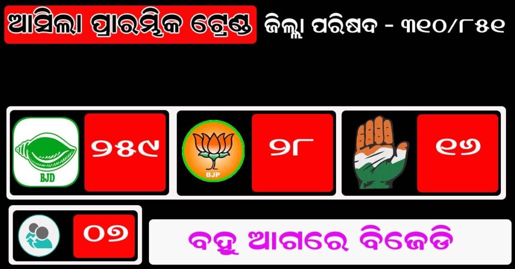 ଭୁବନେଶ୍ୱର ( ଆୱାଜ ମିଡ଼ିଆ ) – ବ୍ୟୁରୋ ରିପୋର୍ଟ : ଆରମ୍ଭ ହୋଇଛି ଗଣତି . ସବୁ ଆକଳନ କୁ ପଛରେ ପକାଇ ବହୁ ଆଗରେ ରହିଛି ଶାସକ ବିଜୁ ଜନତା ଦଳ . ତେବେ ସାମନାକୁ ଆସିଥିବା ଫଳାଫଳ ଏକ ଟ୍ରେଣ୍ଡ . ଯାହା ପରବର୍ତ୍ତୀ ସମୟରେ ବଦଳି ପାରେ . ରାଜ୍ୟ ନିର୍ବାଚନ କମିଶନ ଙ୍କ କାର୍ଯ୍ୟାଳୟ ସୂଚନା ଆଧାରରେ ଅଦ୍ୟାବଧି ଗଣା ଯାଇଥିବା 310 ଟି ଜିଲ୍ଲା ପରିଷଦ ଆସନରେ 259 ଟି ଆସନରେ ବିଜେଡି , 28 ଟି ଆସନରେ ବିଜେପି , 16 ଟି ଆସନରେ କଂଗ୍ରେସ ଏବଂ ଅନ୍ୟାନ୍ୟ ଦଳ 7 ଟି ଆସନରେ ଆଗୁଆ ଅଛନ୍ତି .
