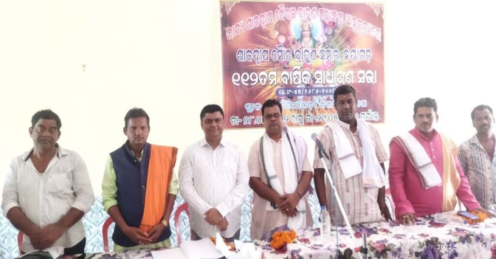 ନୟାଗଡ ( ଆୱାଜ ମିଡ଼ିଆ ) – କିଶୋର ମହାପାତ୍ର : ଶାକ ଦ୍ଵୀପ ସୌର ବ୍ରାହ୍ମଣ ସମାଜର ବାର୍ଷିକ ସାଧାରଣ ସଭା ଓ ଜ୍ୟୋତିଷ ସମ୍ମିଳନୀ ବାଉଁଶିଆପଡା ଠାରେ ୨ ଦିନ ଧରି ଅନୁଷ୍ଠିତ ହୋଇଅଛି । ନୟାଗଡ ଜିଲ୍ଲା ସୌର ବ୍ରାହ୍ମଣ ସମାଜର ସଭାପତି ପୂର୍ଣ୍ଣଚନ୍ଦ୍ର ନାୟକଙ୍କ ସଭାପତିତ୍ଵର ସଭା କାର୍ଯ୍ୟ ଆରମ୍ଭ ହୋଇଥିଲା ।