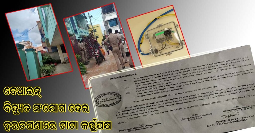ଭୁବନେଶ୍ୱର ( ଆୱାଜ ମିଡ଼ିଆ ) – ଶୁଭ୍ରାଂଶୁ ଶୁଭମୟ ମହାନ୍ତି : ଓଡିଶା ବିଦ୍ୟୁତ ନିୟାମକ ଆୟୋଗର ଖୋଲା ଉଲ୍ଲଙ୍ଘନ କରିଛନ୍ତି ଟାଟା କର୍ତ୍ତୃପକ୍ଷ . ଜଣଙ୍କର ମାଲିକାନା ରେ ଥିବା ସ୍ଥିତିବାନ ଜାଗା ଉପରେ ଅନ୍ୟଜଣଙ୍କୁ ବିଦ୍ୟୁତ ସଂଯୋଗ ଦେଇଥିବାର ଜଣାଯାଇଛି . ଏପରି ଅଭିଯୋଗ ଆଣିଛନ୍ତି ରାଜଧାନୀ ଜାଗମରା ଜଗମୋହନ ନଗର ଅଞ୍ଚଳର ବାସିନ୍ଦା କିଶୋରୀ ମହାନ୍ତି .