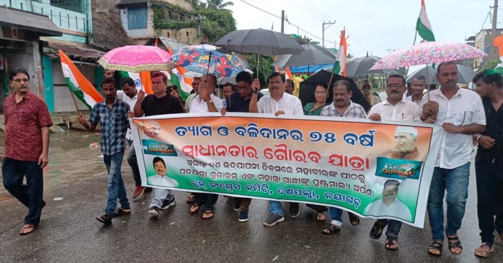 ନୟାଗଡ ( ଆୱାଜ ମିଡ଼ିଆ ) – କିଶୋର ମହାପାତ୍ର : ଭାରତବର୍ଷ କୁ ଇଂରେଜ ଶାସନ ରୁ ମୁକ୍ତ କରି ସ୍ୱାଧୀନ ଭାରତ ର ନୂତନ ପରିଚୟ ପାଇଁ ଜାତୀୟ କଂଗ୍ରେସ ର ତ୍ୟାଗ ବଳିଦାନର ୭୫ ବର୍ଷ ପରିପ୍ରେକ୍ଷୀରେ ପାଳିତ ହୋଇଯାଇଛି ସ୍ୱାଧୀନତାର ଗୌରବ ପଦଯାତ୍ରା । ପ୍ରବଳ ଲଘୁଚାପ ବର୍ଷା ପ୍ରତିକୂଳ ପାଣିପାଗ ସତ୍ୱେ ଦଶପଲ୍ଲାର ମହାବୀର ପୀଠରୁ ରାମଧୁନ ସଙ୍ଗୀତ ଜାତୀୟତାର ମନ୍ତ୍ର ଗାନ କରି ସ୍ୱାଧୀନତାର ଗୌରବ ପଦଯାତ୍ରା ତହସିଲ କାର୍ଯ୍ୟାଳୟ ଗାନ୍ଧୀ ପ୍ରତିମୂର୍ତ୍ତିରେ ପୁଷ୍ପମାଲ୍ୟ ଅର୍ପଣ କରି ଜିଲ୍ଲାବ୍ୟାପି କ୍ରାନ୍ତିଦିବସ ଠାରୁ ଶୁଭାରମ୍ଭ ହୋଇଥିବା ପଦଯାତ୍ରା ଉଦଯାପନ କରାଯାଇଛି l