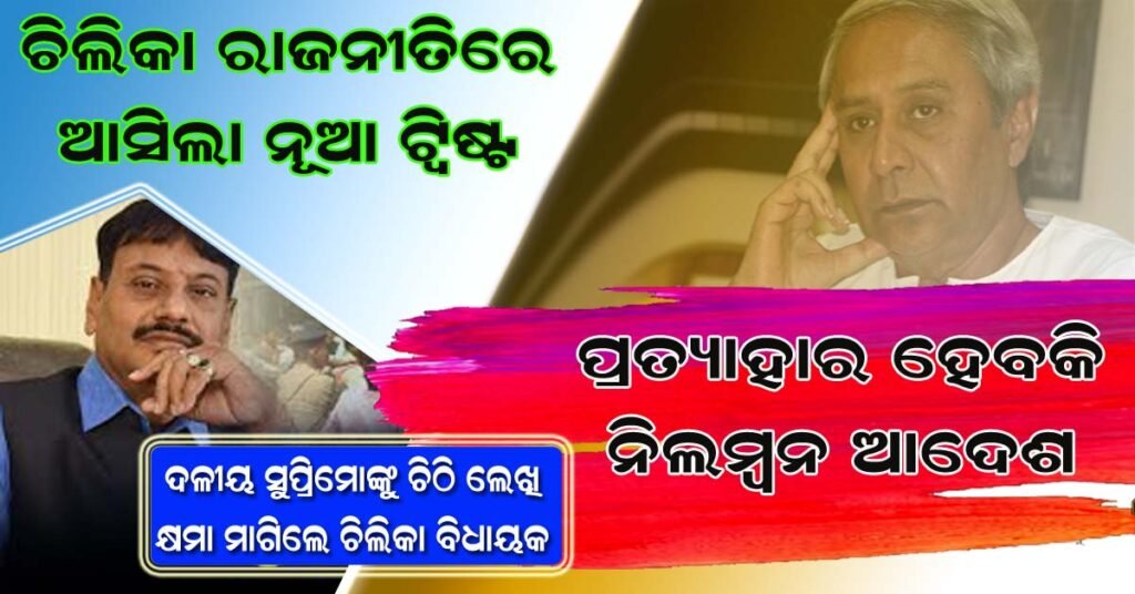 ଚିଲିକା ( ଆୱାଜ ମିଡ଼ିଆ ) – ରାକେଶ ସାହୁ : ନିଜର କୃତକର୍ମ ପାଇଁ କ୍ଷମା ମାଗିଲେ ବିଜେଡି ରୁ ନିଲମ୍ବିତ ନେତା ତଥା ଚିଲିକା ବିଧାୟକ ପ୍ରଶାନ୍ତ ଜଗଦେବ, ଦଳର ସଭାପତିଙ୍କୁ ଲେଖିଲେ ଚିଠି ! ନିଜର ଆକ୍ରମଣାତ୍ମକ କାର୍ଯ୍ୟକଳାପ ସେ ଦୁଃଖିତ ବୋଲି ଲେଖି , ତାଙ୍କୁ କ୍ଷମା କରନ୍ତୁ ବୋଲି ବିଜେଡି ସଭାପତି ନବୀନ ପଟ୍ଟନାୟକଙ୍କୁ ଚିଠି ଲେଖିଛନ୍ତି । ଏହି କଥା ନିଜେ କହିଛନ୍ତି ଚିଲିକା ବିଧାୟକ ପ୍ରଶାନ୍ତ ଜଗଦେବ। ସେ କହିଛନ୍ତି ଯେ, ତାଙ୍କୁ ମାରିଦେବା ପାଇଁ ଏକ ସୁଚିନ୍ତିତ ଷଡ଼ଯନ୍ତ୍ର କରାଯାଇଥିଲା । ହେଲେ ଭଗବାନଙ୍କ ଆର୍ଶିବାଦରୁ ସେଥିରୁ ବଞ୍ଚିଗଲେ ।