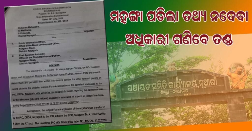 ନୟାଗଡ ( ଆୱାଜ ମିଡ଼ିଆ ) – କିଶୋର ମହାପାତ୍ର : ସୂଚନା ଅଧିକାର ଆଇନରେ ତଥ୍ୟ ଲୁଚାଇବା ମହଙ୍ଗା ପଡ଼ିଲା ! ଜନସୂଚନା ଅଧିକାରୀଙ୍କୁ ଆଠ ହଜାର ଟଙ୍କାର ଆର୍ଥିକ ଦଣ୍ଡ ସହ, କନିଷ୍ଠ ଯନ୍ତ୍ରୀଙ୍କ ନାମରେ କାର୍ଯ୍ୟାନୁଷ୍ଠାନ ନିର୍ଦ୍ଦେଶ ! ତୁରନ୍ତ କାର୍ଯ୍ୟାନୁଷ୍ଠାନ ପାଇଁ ବିଡ଼ିଓ ଙ୍କୁ ନିର୍ଦ୍ଦେଶ ଦେଲେ ରାଜ୍ୟ ସୂଚନା କମିଶନ l ସୂଚନା ଅନୁସାରେ ଆବେଦନକାରୀ ଶିବରାମ ମହାପାତ୍ର ଗତ ୨୦୧୯ ମସିହାରେ ନୟାଗଡ଼ ଜିଲ୍ଲା ନୂଆଗାଁ ବ୍ଲକରେ ମନେରେଗା ରେ କାର୍ଯ୍ୟରତ ଶ୍ରମିକ ମାନଙ୍କ ମଜୁରୀ ଦିଆଯାଉ ନଥିବା ପ୍ରସଙ୍ଗରେ ସୂଚନା ଅଧିକାର ଆଇନରେ ତଥ୍ୟ ମାଗିଥିଲେ l ନୟାଗଡ଼ ନୂଆଗାଁ ବ୍ଲକ ଅନ୍ତର୍ଗତ ମହୀତମା ମହାଦେବ ପୋଖରୀ ଖୋଳାରେ କେତେ ଟଙ୍କା ଖର୍ଚ୍ଚ ହୋଇଛି ଓ ଅଦ୍ୟାବଧି କେଉଁ କାରଣରୁ ଏଥିରେ ନିୟୋଜିତ ଶ୍ରମିକଙ୍କୁ ସେମାନଙ୍କର ମଜୁରୀ ମିଳିନାହିଁ ଏନେଇ ବିସ୍ତୃତ ତଥ୍ୟ ଦେବାକୁ ଏହି ଆବେଦନରେ ଦର୍ଶାଯାଇଥିଲା l ତେବେ ଏହି ତଥ୍ୟ ୱେବସାଇଟରେ ଉପଲବ୍ଧ ନଥିବା ଦର୍ଶାଇ ତତ୍କାଳୀନ ନୂଆଗାଁ ବ୍ଲକ ଜନସୂଚନା ଅଧିକାରୀ ବିଭ୍ରାନ୍ତକର ତଥ୍ୟ ପ୍ରଦାନ କରିଥିଲେ l ଏହାପରେ ନୂଆଗାଁ ବିଡ଼ିଓଙ୍କ ପାଖରେ ପୁଣିଥରେ ଏହି ତଥ୍ୟ ଦେବାକୁ ନେଇ ପ୍ରଥମ ଅପିଲ କରିଥିଲେ ଶିବରାମ l ତେବେ, ଏହାସତ୍ୱେ ଶିବରାମଙ୍କୁ ସଠିକ ତଥ୍ୟ ମିଳିନଥିବା ଅଭିଯୋଗ କରି ରାଜ୍ୟ ସୂଚନା କମିଶନଙ୍କ ଦ୍ୱାରସ୍ଥ ହୋଇଥିଲେ l ଏନେଇ ରାଜ୍ୟ ସୂଚନା କମିଶନଙ୍କ ନିକଟରେ ୯୦୬/୨୦୧୯ ରେ ଏକ ମାମଲା ରୁଜୁ ହୋଇଥିଲା l ତେବେ ଦୀର୍ଘ ୩ବର୍ଷ ପରେ ଏହି ମାମଲାରେ ଉଭୟ ପକ୍ଷଙ୍କ ସମସ୍ତ ଯୁକ୍ତିର ଶୁଣାଣି କରି ବିଭ୍ରାନ୍ତକର ତଥ୍ୟଦେବା ଅଭିଯୋଗରେ ରାଜ୍ୟ ସୂଚନା କମିଶନର ବି. କେ ମହାପାତ୍ର ନୂଆଗାଁ ବ୍ଲକରେ କାର୍ଯ୍ୟରତ ଜନସୂଚନା ଅଧିକାରୀ ମଳୟ ରଂଜନ ଚିନାରାଙ୍କୁ ୮ ହଜାର ଟଙ୍କାର ଆର୍ଥିକ ଦଣ୍ଡାଦେଶ ଶୁଣାଇବା ସହ ଆଗାମୀ ଏକ ମାସ ମଧ୍ୟରେ ଏହି ଅର୍ଥରାଶି ଜମା ନକଲେ ୨ ମାସର ଦରମାରୁ ଅଗ୍ରିମ ଭାବେ ଏହି ଅର୍ଥ ରାଶିକୁ ସରକାରୀ ତହବିଲରେ ଜମା କରିବାକୁ ନିର୍ଦ୍ଦେଶ ଦେଇଛନ୍ତି l ସେପଟେ ମନେରେଗାରେ କାର୍ଯ୍ୟରତ ଶ୍ରମିକ ମାନଙ୍କ ବକେୟା ଟଙ୍କା ନଦେବା ଓ ସରକାରୀ ତଥ୍ୟ ହଜାଇବା ନେଇ ସର୍ଭିସ ରୁଲ ଅନୁସାରେ ତତ୍କାଳୀନ କନିଷ୍ଠ ଯନ୍ତ୍ରୀ ଇଂ. ବସନ୍ତ ସାହୁଙ୍କ ନାମରେ ଶୃଙ୍ଖଳାଗତ କାର୍ଯ୍ୟାନୁଷ୍ଠାନ ନେବାକୁ ନୂଆଗାଁ ବିଡ଼ିଓଙ୍କୁ ନିର୍ଦେଶ ଦେଇଛନ୍ତି ରାଜ୍ୟ ସୂଚନା କମିଶନର l ତେବେ ଆବେଦନକାରୀ ନିଜେ ଆଇନଜୀବୀ ଶିବରାମ ମହାପାତ୍ର ଏହି ମାମଲା ପରିଚାଳନା କରିଥିବା ବେଳେ ମାନ୍ୟବର ସୂଚନା କମିଶନଙ୍କ ଏହି ରାୟକୁ ଆବେଦନକାରୀ ସ୍ୱାଗତ କରିଛନ୍ତି l