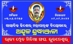 ଭୁବନେଶ୍ୱର ( ଆୱାଜ ମିଡ଼ିଆ ) – ବ୍ୟୁରୋ ରିପୋର୍ଟ : ନୟାଗଡ଼ର ବରିଷ୍ଠ ସାମ୍ବାଦିକ କିଶୋର ମହାପାତ୍ର ଙ୍କ ଅକାଳ ବିୟୋଗ ଖବର ଶୁଣି ମର୍ମାହତ ହୋଇଛନ୍ତି ଗଣମାଧ୍ୟମ ପ୍ରତିନିଧି ! ସାମ୍ବାଦିକ କିଶୋର ମହାପାତ୍ର ଙ୍କ ନିଧନ ଖବର ଶୁଣି ରାଜ୍ୟ ୱେବ ମିଡ଼ିଆ ସଂଘ ତରଫରୁ ଗଭୀର ଶୋକ ପ୍ରକାଶ କରାଯାଇଛି ! ନୟାଗଡ ଜିଲ୍ଲା ଡିଜିଟାଲ ମିଡ଼ିଆ ୟୁନିୟନ ର ସମ୍ପାଦକ ଦାୟିତ୍ୱରେ ଥିବା କିଶୋର ମହାପାତ୍ରଙ୍କ ଅକାଳ ବିୟୋଗ ଡିଜିଟାଲ ମିଡ଼ିଆ ସଂଘ ପ୍ରତି ଏକ ଅପୂରଣୀୟ କ୍ଷତି ବୋଲି ପ୍ରକାଶ କରିଛନ୍ତି ରାଜ୍ୟ ୱେବ ମିଡ଼ିଆ ସଂଘର କର୍ମକର୍ତ୍ତା !