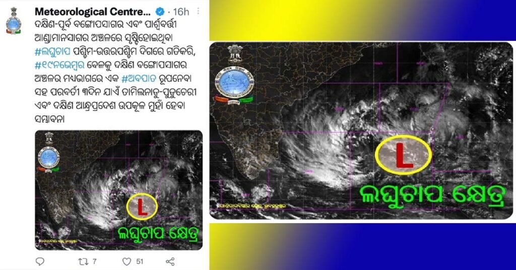 ଭୁବନେଶ୍ୱର ( ଆୱାଜ ମିଡ଼ିଆ ) – ବ୍ୟୁରୋ ରିପୋର୍ଟ : ଦକ୍ଷିଣ – ପୂର୍ବ ବଙ୍ଗୋପସାଗର ଏବଂ ପାର୍ଶ୍ଵବର୍ତ୍ତୀ ଆଣ୍ଡାମାନ ସାଗର ଅଞ୍ଚଳରେ ସୃଷ୍ଟି ହୋଇଥିବା ଲଘୁଚାପ ପଶ୍ଚିମ – ଉତ୍ତର ପଶ୍ଚିମ ଦିଗରେ ଗତିକରି, ୧୯ନଭେମ୍ବର ବେଳକୁ ଦକ୍ଷିଣ ବଙ୍ଗୋପସାଗର ଅଞ୍ଚଳର ମଧ୍ୟ ଭାଗରେ ଏକ ଅବପାତ ରୂପନେବା ସହ ପରବର୍ତୀ ୩ ଦିନ ଯାଏଁ ତାମିଲନାଡୁ-ପୁଡୁଚେରୀ ଏବଂ ଦକ୍ଷିଣ ଆନ୍ଧ୍ରପ୍ରଦେଶ ଉପକୂଳ ମୁହାଁ ହେବା ସମ୍ଭାବନା l ୨୧ ତାରିଖ ବେଳକୁ ଗଞ୍ଜାମ, ଗଜପତି, ରାୟଗଡା, କନ୍ଧମାଳ, ରାୟଗଡା, ମାଲକାନଗିରି, କୋରାପୁଟ ଜିଲ୍ଲାର ଗୋଟିଏ ରୁ ଦୁଇଟି ସ୍ଥାନରେ ହାଲୁକା ରୁ ମଧ୍ୟମ ଧରଣର ବର୍ଷା ସମ୍ଭାବନା ରହିଛି l