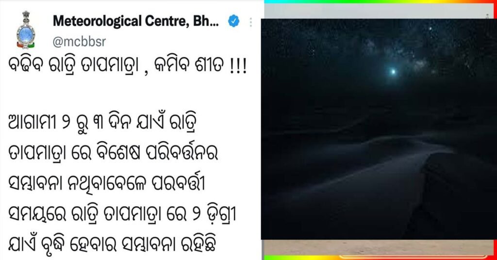 ଭୁବନେଶ୍ୱର ( ଆୱାଜ ମିଡ଼ିଆ ) – ବ୍ୟୁରୋ ରିପୋର୍ଟ : ରାଜ୍ୟର ପ୍ରାୟତଃ ସ୍ଥାନରେ ଶୀତ ବଢିଥିବା ସମୟରେ ପାଣିପାଗ କୁ ନେଇ ଆସିଲା ନୂଆ ଅପଡେଟ ! ଆଗାମୀ ୨ ରୁ ୩ ଦିନ ଯାଏଁ ରାତ୍ରି ତାପମାତ୍ରା ରେ ବିଶେଷ ପରିବର୍ତ୍ତନର ସମ୍ଭାବନା ନଥିବା ବେଳେ ପରବର୍ତ୍ତୀ ସମୟରେ ରାତ୍ରି ତାପମାତ୍ରା ରେ ୨ ଡ଼ିଗ୍ରୀ ଯାଏଁ ବୃଦ୍ଧି ହେବାର ସମ୍ଭାବନା ରହିଛି ! ଫଳରେ ଶୀତ ର ମାତ୍ରା ମଧ୍ୟ ସାମାନ୍ୟ କମିବ !