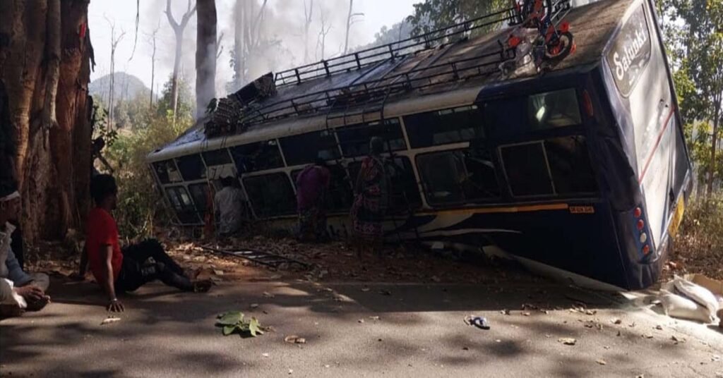 ଭାରସାମ୍ୟ ହରାଇ ରାସ୍ତା ତଳକୁ ଖସିଗଲା ଯାତ୍ରୀବାହୀ ବସ୍‌ : ୩୦ ରୁ ଅଧିକ ଯାତ୍ରୀ ଆହତ : ୬ ଗୁରୁତର !!!