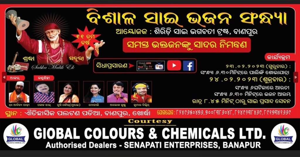 ଆସନ୍ତା ୨୪ ତାରିଖରେ ବାଣପୁର ପଲଟଣ ପଡ଼ିଆରେ ଅନୁଷ୍ଠିତ ହେବ ସାଇ ଭଜନ ସନ୍ଧ୍ୟା !!!