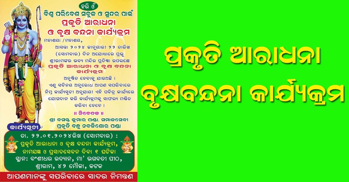 କଟକ ସଦର ( ଆୱାଜ ମିଡ଼ିଆ ) – ଶ୍ରୀକାନ୍ତ ବେଉରା : ପ୍ରଭୁ ଶ୍ରୀରାମଙ୍କ ବିଗ୍ରହ ପ୍ରାଣ ପ୍ରତିଷ୍ଠା ଓ ମନ୍ଦିର ପ୍ରତିଷ୍ଠା ଅବସରରେ ସେହିଦିନ କଟକ ସଦର ୪୨ ମୌଜା ଅନ୍ତର୍ଗତ ଶ୍ରୀରାମ କାଠଯୋଡି ନଦୀ କୂଳରେ “ପ୍ରକୃତି ଆରାଧନା ଓ ବୃକ୍ଷ ବନ୍ଦନା” କାର୍ଯ୍ୟକ୍ରମ କରିବା ପାଇଁ ଏକ ପ୍ରସ୍ତୁତି ବୈଠକ ଅନୁଷ୍ଠିତ ହୋଇଯାଇଛି। ଦିନକୁ ଦିନ ପରିବେଶ ଅବନତି କାରଣରୁ ବିଶ୍ଵ ଉତ୍ତପ୍ତ ହୋଇ ଜୀବଜଗତ ପାଇଁ ଅନେକ ସମସ୍ୟା ସୃଷ୍ଟି ହୋଇ ହୋଇ ଚାଲିଛି। ଜୀବଜଗତ କଲ୍ୟାଣ ଉଦ୍ଦେଶ୍ୟରେ ପ୍ରକୃତି ମାତାର କୃପା ଲାଭ ଓ ବିଶ୍ଵ ପରିବେଶ ସବୁଜ ସୁନ୍ଦର ପାଇଁ ଏହିଦିନ ୧୨ ଘଣ୍ଟା ବ୍ୟାପୀ ନାମ ସଂକ୍ରୀତ୍ତନ ସହ ଧରିତ୍ରୀ ପୂଜା ଓ ବୃକ୍ଷ ବନ୍ଦନା କାର୍ଯ୍ୟକ୍ରମ ଅନୁଷ୍ଠିତ ହେବ। ପ୍ରକୃତି ବନ୍ଧୁ ନବକିଶୋର ପଣ୍ଡାଙ୍କ ଆହ୍ଵାନ କ୍ରମେ ଲେଟସ୍ କ୍ରିଏଟ ଫରେଷ୍ଟସ୍ ସଭାପତି ତଥା ସମାଜସେବୀ ବସନ୍ତ ପଣ୍ଡା, ସମ୍ପାଦକ ଭଗବତୀ ପ୍ରସାଦ ପତି, ଚନ୍ଦନ ପଣ୍ଡା, ଶକ୍ତି ପ୍ରସାଦ ପଣ୍ଡା, ଦେବାଶିଷ ଦୀକ୍ଷିତ, ଲକ୍ଷ୍ମଣ ଦୀକ୍ଷିତ ପ୍ରଭୃତିଙ୍କ ସହ ଅନେକ ସ୍ଥାନୀୟ ଯୁବକ ଏହି ଆଲୋଚନାରେ ଅଂଶଗ୍ରହଣ କରିଥିଲେ। ଏହି କାର୍ଯ୍ୟକ୍ରମରେ ବହୁ ମାନ୍ୟଗଣ୍ୟ ବିଶିଷ୍ଟ ବ୍ୟକ୍ତିତ୍ୱ ଯୋଗଦେବା ପାଇଁ ସମ୍ମତି ପ୍ରଦାନ କରିଛନ୍ତି।