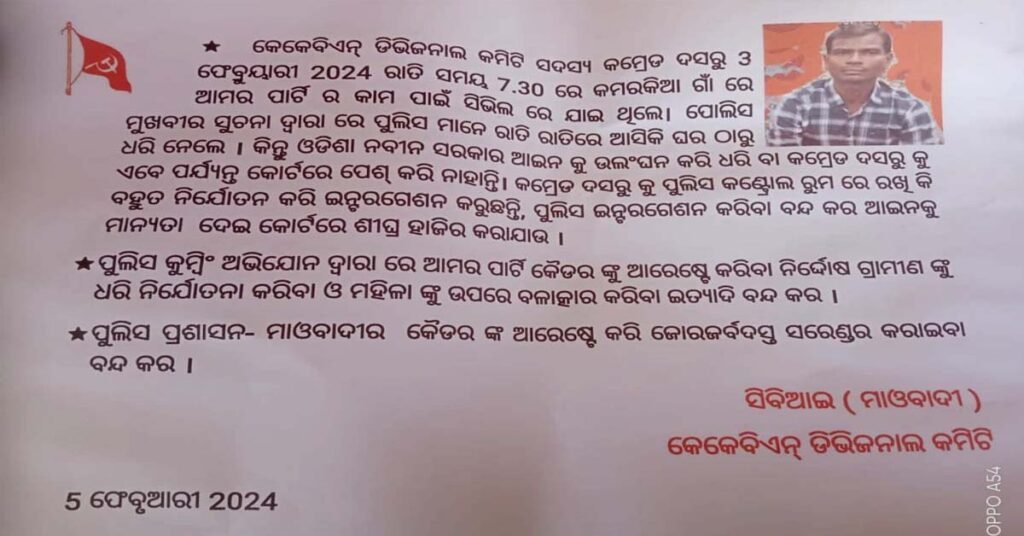 ରାଜ୍ୟପଥ କଡ଼ରୁ ଜବତ ହୋଇଥିବା ପୋଷ୍ଟରରେ ଲେଖାଯାଇଛି ଯେ, ଚଳିତ ମାସ ଫେବୃଆରୀ ୩ ତାରିଖ ସନ୍ଧ୍ୟାରେ ଆମ ପାର୍ଟିର କାମ ପାଇଁ ଦସରୁ କାମ୍ବେରକିଆ ଗାଁ ଯାଇଥିଲେ । ପୋଲିସ ମୁଖବୀର ସୂଚନା ପାଇ ଆସି ତାଙ୍କୁ ଧରିନେଇଛନ୍ତି । ହେଲେ ତାଙ୍କୁ ଏପର୍ଯ୍ୟନ୍ତ କୋର୍ଟରେ ହାଜର କରିନାହାନ୍ତି । ତାଙ୍କୁ କଣ୍ଟ୍ରୋଲ ରୁମ୍ରେ ରଖି ନିର୍ଯାତନା ଦେଇ ଇଣ୍ଟୋରୋଗେସନ୍ କରୁଛି ପୋଲିସ । ତାଙ୍କୁ ନିର୍ଯାତନା ଓ ଇଣ୍ଟୋରୋଗେସନ୍ ବନ୍ଦ କରି ତୁରନ୍ତ କୋର୍ଟରେ ହାଜର କରାଯାଉ । କୁମ୍ବିଂ ଅପରେସନ୍ ଦ୍ବାରା ଆମ ପାର୍ଟି କ୍ୟାଡରଙ୍କୁ ଆରେଷ୍ଟ କରିବା ଏବଂ ନିର୍ଦ୍ଦୋଷ ଗ୍ରାମୀଣଙ୍କୁ ନିର୍ଯାତନା ଦେବା ବନ୍ଦ କରାଯାଉ । ତେବେ କେକେବିଏନ୍ ମାଓ ସଂଗଠନର ଏହି ପୋଷ୍ଟର ଦେଖି ସ୍ଥାନୀୟ ଅଞ୍ଚଳରେ ସାଧାରଣ ଲୋକଙ୍କ ମଧ୍ୟରେ ଭୟର ବାତାବରଣ ଖେଳିଯାଇଛି ।