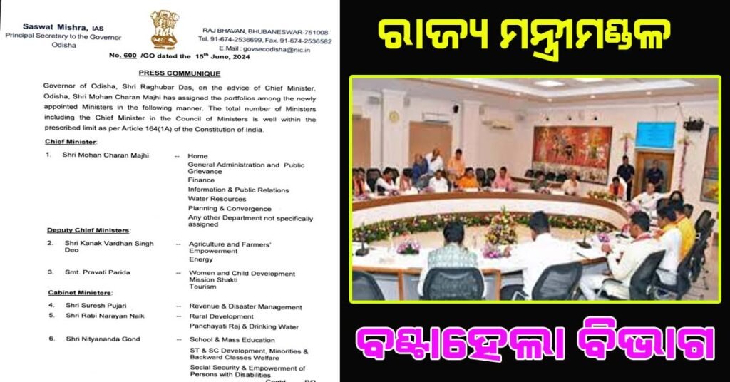 ଭୁବନେଶ୍ୱର ( ଆୱାଜ ମିଡ଼ିଆ ) – ନିରଞ୍ଜନ ସାହୁ : ରାଜ୍ୟରେ ନୂଆ ସରକାରରେ ମନ୍ତ୍ରୀଙ୍କୁ ବିଭାଗ ବଣ୍ଟନ ! ମୁଖ୍ୟମନ୍ତ୍ରୀଙ୍କ ପାଖରେ ଗୃହ, ସାଧାରଣ ପ୍ରଶାସନ, ସୂଚନା ଓ ଲୋକସମ୍ପର୍କ , ଜଳ ସମ୍ପଦ, ଯୋଜନା ଓ ସଂଯୋଜନ ବିଭାଗ ରଖିଲେ ମୁଖ୍ୟମନ୍ତ୍ରୀ ! ଉପ ମୁଖ୍ୟମନ୍ତ୍ରୀ କେ.ଭି. ସିଂହ ଦେଓ କୃଷି ଓ କୃଷକ ସଶକ୍ତୀକରଣ, ଶକ୍ତି ଉପ ମୁଖ୍ୟମନ୍ତ୍ରୀ ପ୍ରଭାତୀ ପରିଡ଼ା ମହିଳା ଓ ଶିଶୁ ବିକାଶ, ମିଶନ ଶକ୍ତି, ପର୍ଯ୍ୟଟନ ବିଭାଗ , ସୁରେଶ ପୂଜାରୀ ରାଜସ୍ୱ ଓ ବିପର୍ଯ୍ୟୟ ପରିଚାଳନା , ରବି ନାୟକ ଗ୍ରାମ୍ୟ ଉନ୍ନୟନ, ପଞ୍ଚାୟତିରାଜ ଓ ପାନୀୟଜଳ , ନିତ୍ୟାନନ୍ଦ ଗଣ୍ଡ ବିଦ୍ୟାଳୟ ଓ ଗଣଶିକ୍ଷା, SC/ST ଉନ୍ନୟନ, ସଂଖ୍ୟାଲଘୁ ବିଭାଗ , କୃଷ୍ଣଚନ୍ଦ୍ର ପାତ୍ର ଖାଦ୍ୟ ଯୋଗାଣ, ବିଜ୍ଞାନ ଓ ପ୍ରଯୁକ୍ତି , ପୃଥ୍ୱୀରାଜ ହରିଚନ୍ଦନ ଆଇନ୍, ପୂର୍ତ୍ତ, ଅବକାରୀ , ମୁକେଶ ମହାଲିଙ୍ଗ ସ୍ୱାସ୍ଥ୍ୟ ଓ ପରିବାର କଲ୍ୟାଣ, ସଂସଦୀୟ ବ୍ୟାପାର , ବିଭୂତି ଭୂଷଣ ଜେନା ବାଣିଜ୍ୟ ଓ ପରିବହନ, ଇସ୍ପାତ ଓ ଖଣି , କୃଷ୍ଣଚନ୍ଦ୍ର ମହାପାତ୍ର ଗୃହ ଓ ନଗର ଉନ୍ନୟନ, ସାଧାରଣ ଉଦ୍ୟୋଗ ବିଭାଗ ଦାୟିତ୍ୱ ନେଇଛନ୍ତି !